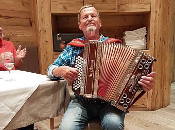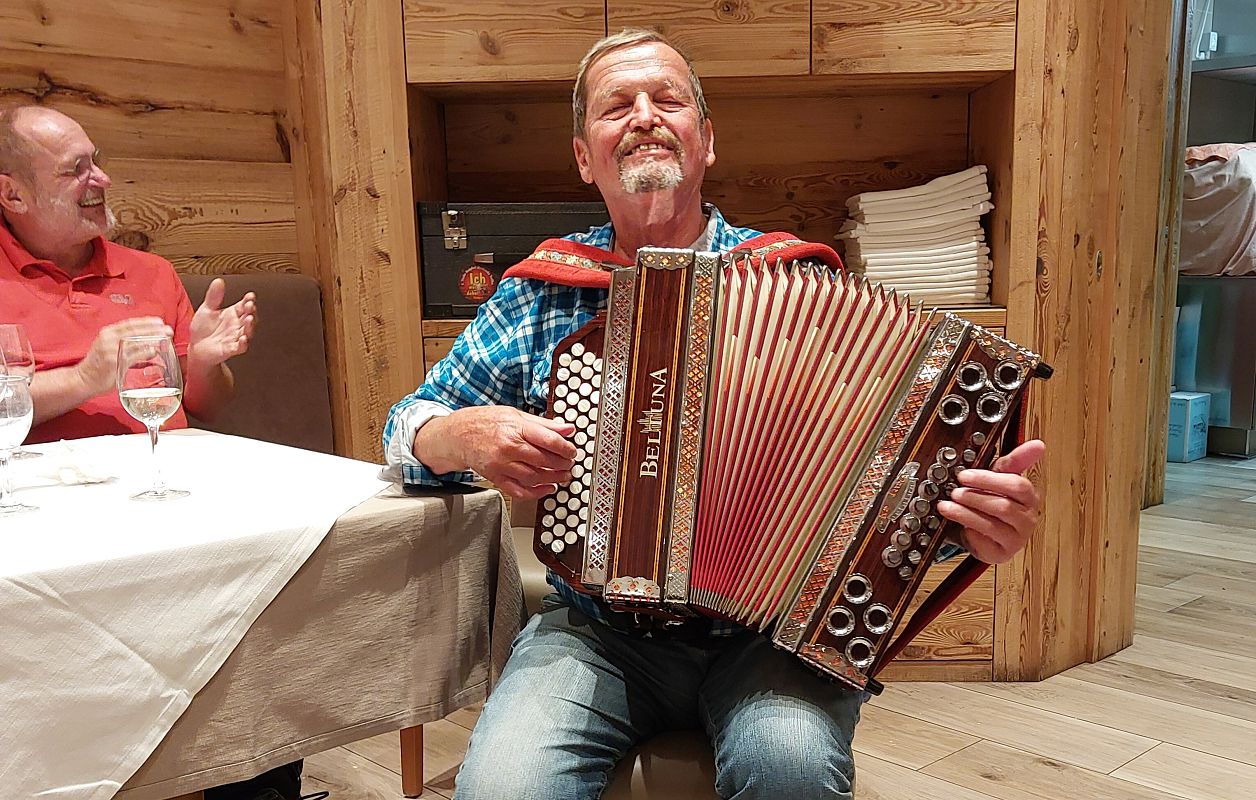 Gegen 17 Uhr erreichten die Teilnehmer das Hotel "Lady Maria" in Fondo, wo das Check-in erfolgte. Der Abend klang bei einem gemeinsamen Abendessen gemütlich aus. Anschließend sorgte Peter mit seiner Ziehharmonika für musikalische Unterhaltung und einige "Junggebliebene" schwangen das Tanzbein – ein stimmungsvoller Abschluss des ersten Reisetages.